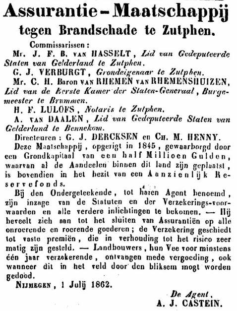 Toen de Nederlandsche Maatschappij van Brandverzekering in 1844 haar regels veranderde en deze subagenten wilde omzetten naar (onafhankelijke) agenten, richtten Dercksen en Henny daarop de AMB op. Deze zou in de loop der jaren flink groeien, zowel in aantal klanten als in agenten.