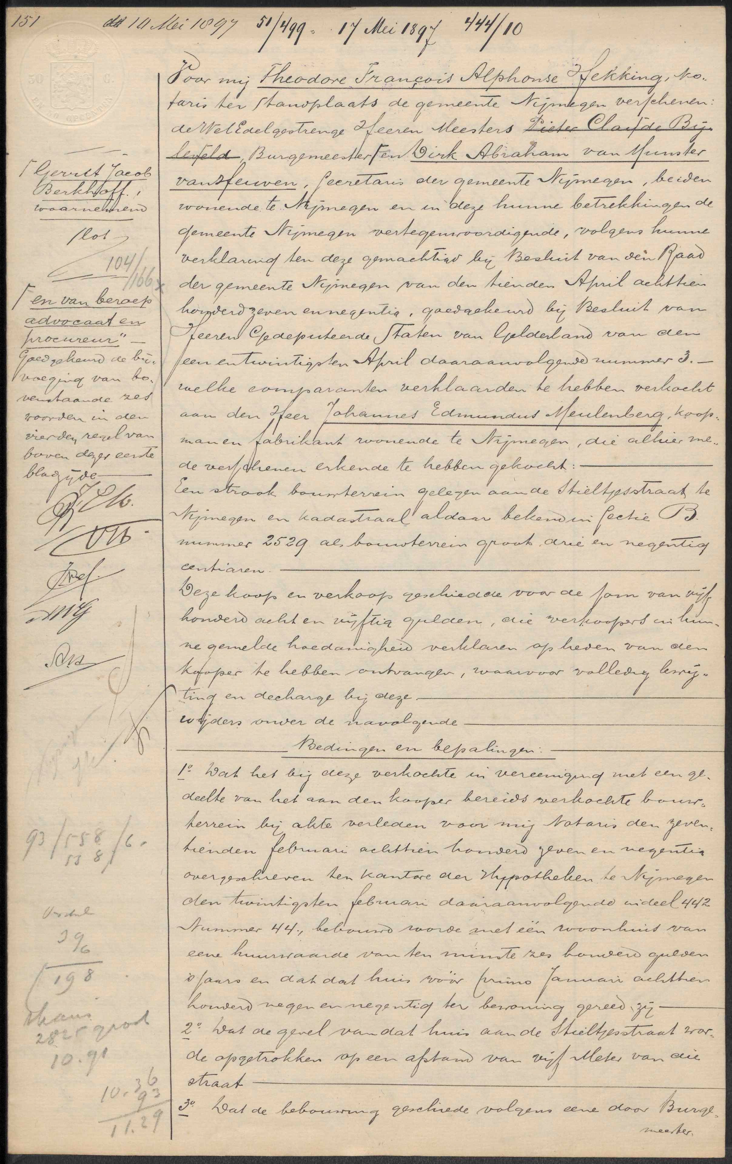 Op 10 mei 1897 verkoopt de gemeente Nijmegen een strook bouwterrein aan de Stieltjesstraat, te bebouwen – in vereeniging met een gedeelte van het aan den kooper bereids verkochte terrein bij akte van 17 februari 1897 – met één woonhuis, Sectie B nr. 2529 groot 93 centiaren. Zie ook onder: