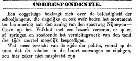 Op 8 augustus 1865 werd de spoorlijn Nijmegen-Cleve geopend. In 1884 werd de Nijmeegse Spoorweg Maatschappij geliquideerd. Daar Nijmegen meerdere verbindingen had gekregen, was het logisch dat het Staatsspoor ook de lijn naar Kleef zou overnemen. In de laatste vergadering der aandeelhouders, waarin met algemene stemmen de verkoop van de aandelen aan het Staatsspoor werd goedgekeurd, gingen ook stemmen op om de directie een huldeblijk aan te bieden. De directie wilde echter geen persoonlijke hulde. Daarom werd gekozen voor een monument, dat totstandkoming van het spoor Nijmegen-Kleef in herinnering zou houden.