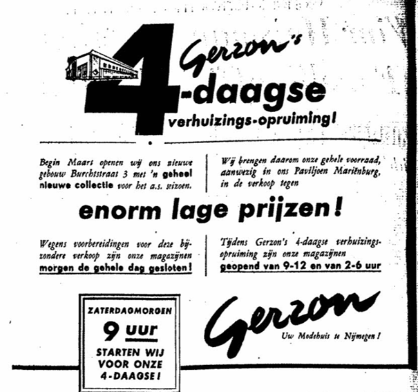 In de hierboven afgebeelde advertentie meldt Gerzon hun grote verbouwingsopruiming. Een advertentie in De Gelderlander 9/3/1954 kondigt een veiling op 12 maart aan in het voormalig gebouw “Gerzon”, Mariënburg, aan.