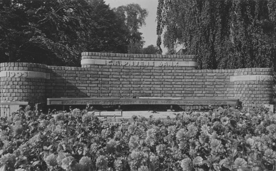 Estourgie ontwierp een gedenkmuur, met aan weerszijden twee lantaarns. Van Teeseling maakte een tegeltableau in reliëf. Deze werd centraal in de muur geplaatst.