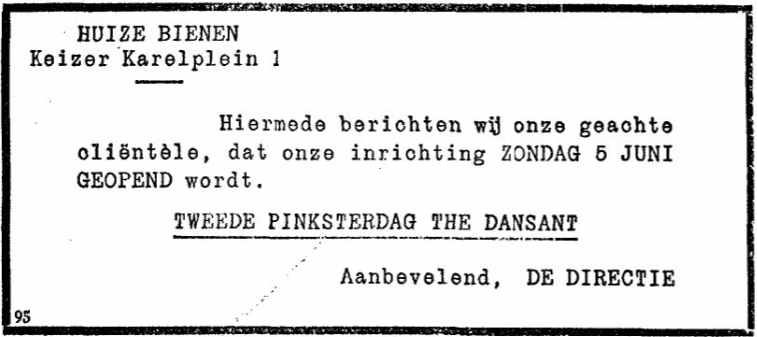 Naar de heer Bienen ons mededeelt, zal zijn inrichting, sinds December j.l. gevestigd in het perceel Oude Stadsgracht 19 (vroeger Maison Roelofsen), in Mei worden overgebracht naar het pand aan het Keizer Karelplein, dat laatstelijk eigendom is geweest van de Amsterdamse Bank. De villa zal naar het ontwerp van den architect Oscar Leeuw worden verbouwd. De heer Bienen zal in het nieuwe pand een Bodea met restaurant openen en zich verder specialiseeren voor besloten partijen.