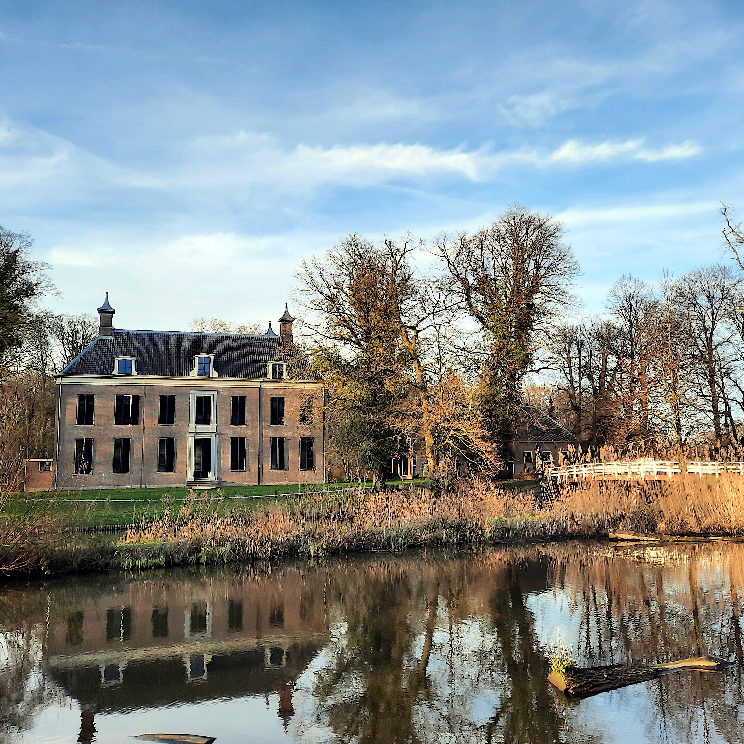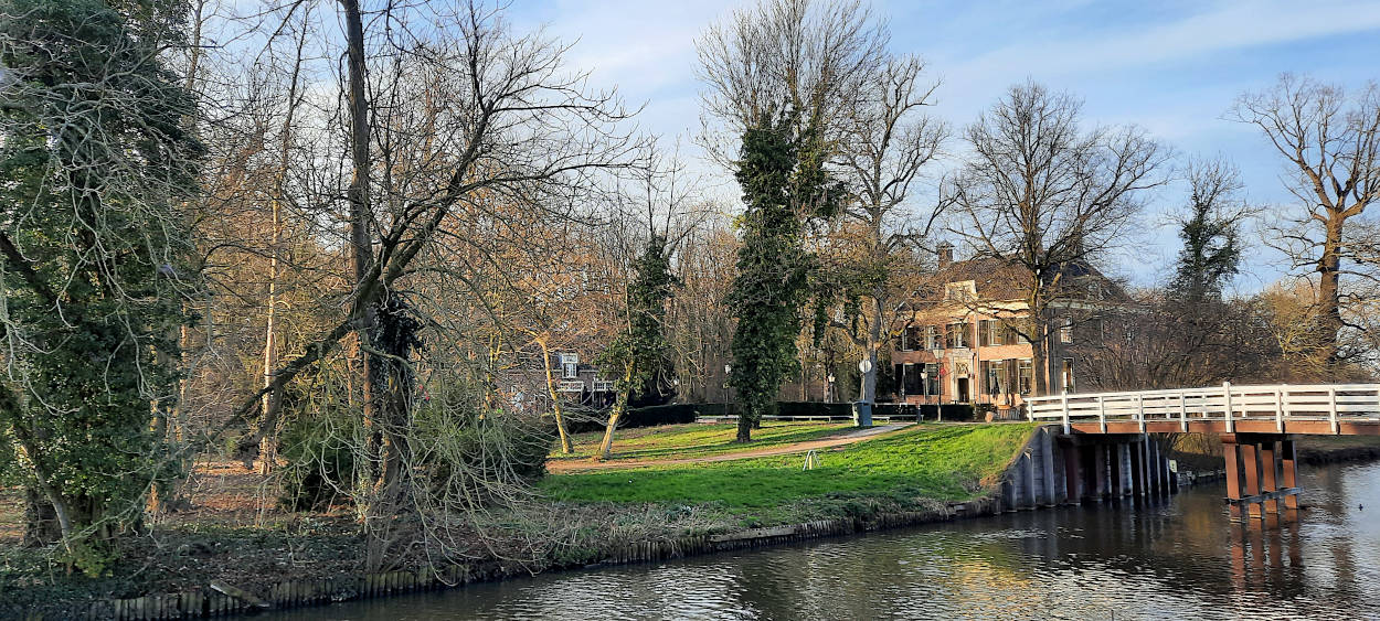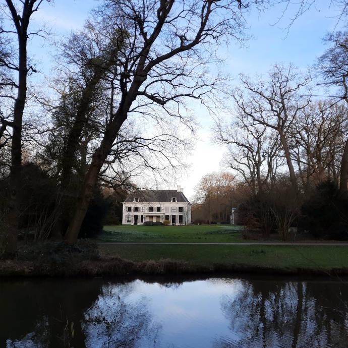 Rechts is het landgoed Oud Amelisweerd te zien. Het huis maakt samen met het koetshuis en tuin onderdeel uit van de buitenplaats.