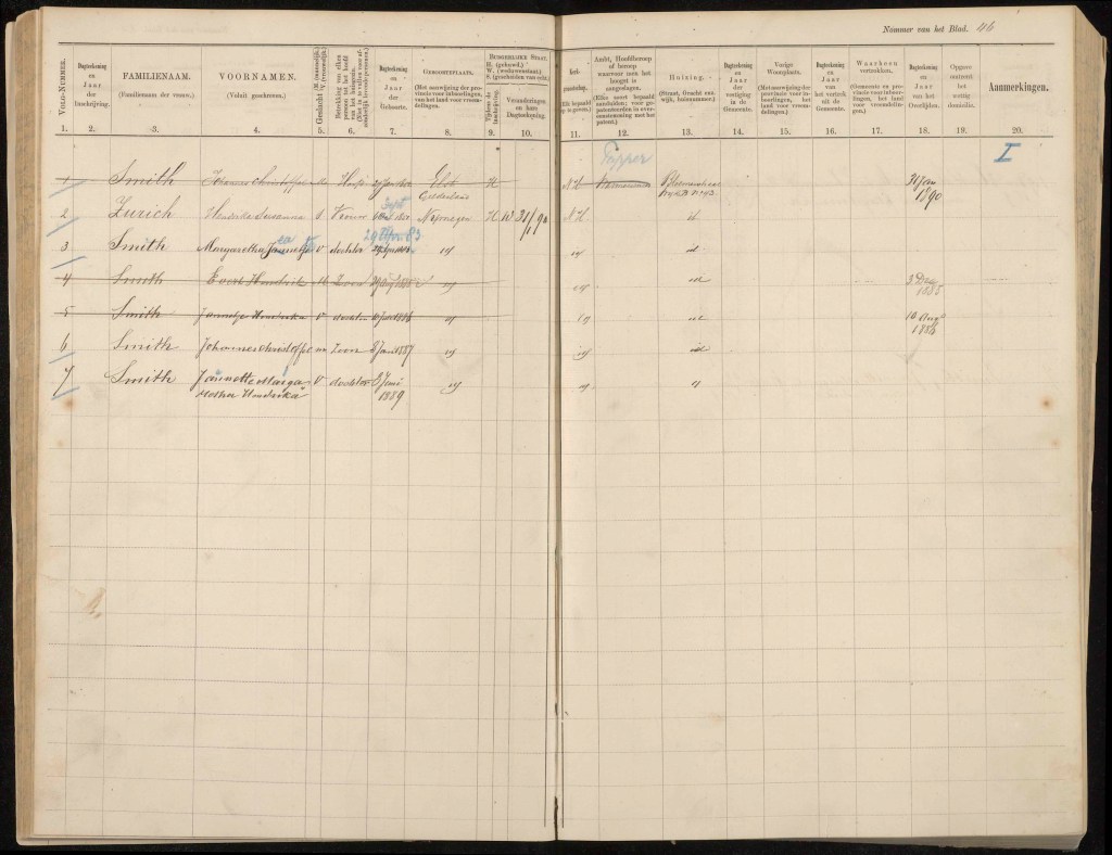 In november 1881 krijgt J.C. Smith vergunning tot “verkoop van sterken drank in het klein” “in het voorhuis en kamer van het huis aan de Walstraat B. No. 13. Bij de bekendmaking van deze vergunning waren er vele anderen aan wie tevens een vergunning werd verleend: mogelijk vanwege nieuwe regelgeving? (PGNC 25/11/1881). Bij een advertentie wordt hij “koffijhuishouder Smith in de Bloemerstraat genoemd. (PGNC 15/9/1886). Bij de bevalling van hun zoon op 8 juni blijkt Smith getrouwd te zijn met Hendrika Suzanna Zurich (PGNC 9/6/1887) In 887 is het Café Smith (“Vraag de echte Friesche Boerenjongens” (PGNC 18/12/1887)