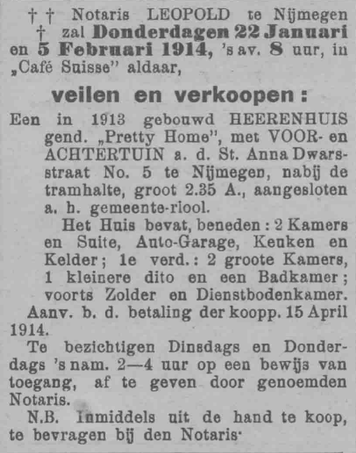 In januari 1914 wordt de veiling aangekondigd van “Pretty Home”, zie bovenstaande advertentie.