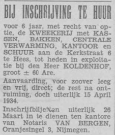 In 1934 staan de advertenties dat de kwekerij voor 6 jaar te huur is en dat “wegens opheffing der Kweekerij alle Planten tegen zeer lagen prijs uitverkocht”.